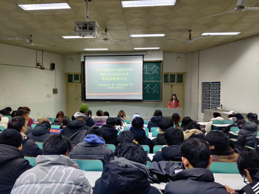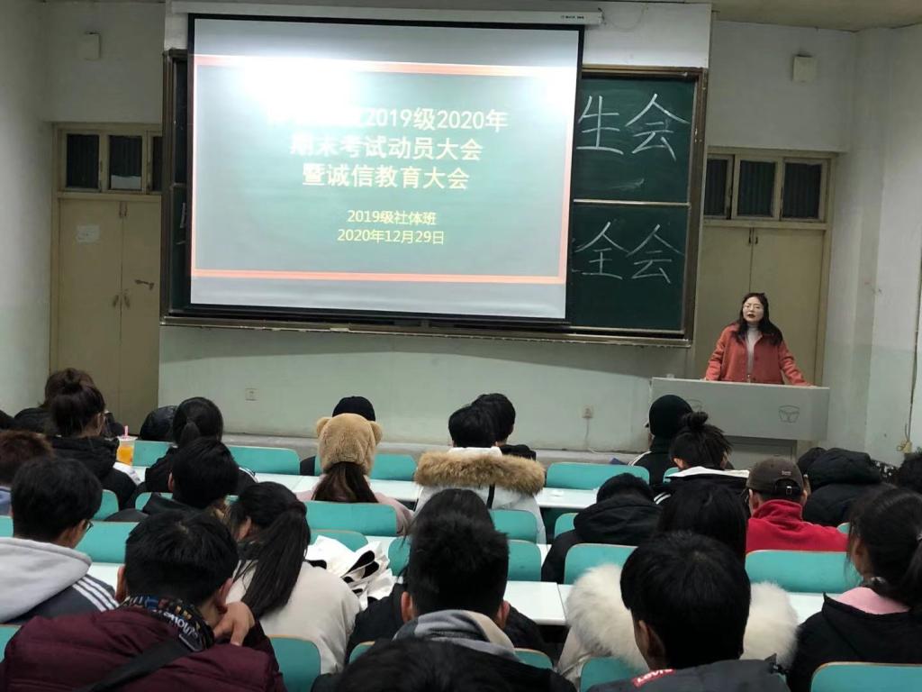 为了迎接马上到来的期末考试,2020年12月29日,hg皇冠官网2019级同学在人文楼109举行了期末考试动员大会暨诚信教育大会。2019级辅导员赖梦玥老师主持本次会议,2019级体育教育专业和社会体育指导与管理专业全体学生参与会议。