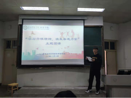 为深入学习习近平总书记在2020年11月24日的全国劳动模范和先进工作者表彰大会上关于劳模精神的重要讲话,培养新时代青年大学生艰苦奋斗吃苦耐劳的精神。hg皇冠官网2019级社会体育指导与管理班在12月20日上午于人文楼109举办了以学习劳模精神为主题的团课,此次团课由团支书带领19级社体班全体同学进行学习。