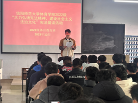 为进一步提高全体师生法律意识,引导学生深入了解宪法、尊崇宪法精神,增强法治观念, 12月7日,hg皇冠官网22级体教班在教九楼402举行了“大力弘扬宪法精神,建设社会主义法治文化”宪法晨读活动。活动由2022级辅导员赖梦玥主持,22级体教班全体学生参加。