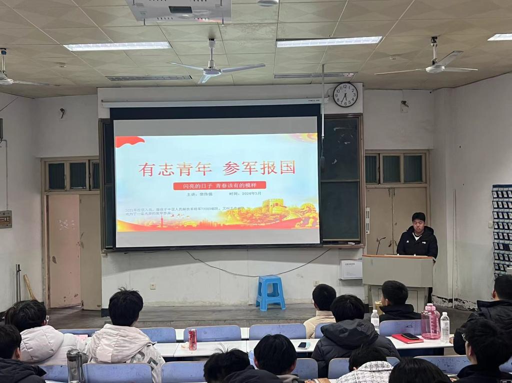 班会上,退伍大学生康树华、柴伟强、王毅、辛帅向同学们讲述了他们的部队生活,全面系统地介绍了国家征兵政策及大学生应征入伍的各项优惠政策,并向同学们发放征兵宣传手册,赖梦玥老师依照当前征兵工作的新形势、新特点,围绕应征条件、入伍程序、职业规划、退伍安置、就业扶持等重点内容为同学们全面解读入伍政策。