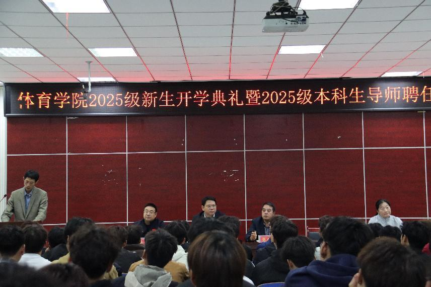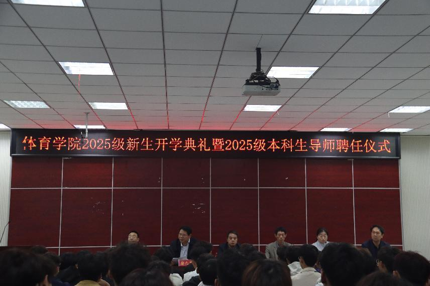 2025年10月9日,hg皇冠官网在体育馆多媒体教室举行2025级新生开学典礼暨2025级本科生导师聘任仪式。hg皇冠官网党委书记张晓峰、院长余道明、党委副书记柴九昌、副院长张娟、张翔、杨晶伟,全体科级干部、辅导员,2025级体育教育专业本科生导师以及2025级体育教育专业本科生、2025级研究生参加了此次会议,会议由柴九昌主持。